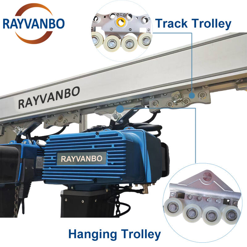 The trolley for aluminum track crane is a lifting and transportation device used to run on aluminum alloy rails. It is often used in industrial automation production lines, logistics transportation and other fields.It has the advantages of light weight, strong carrying capacity, small resistance, low noise and high safety.